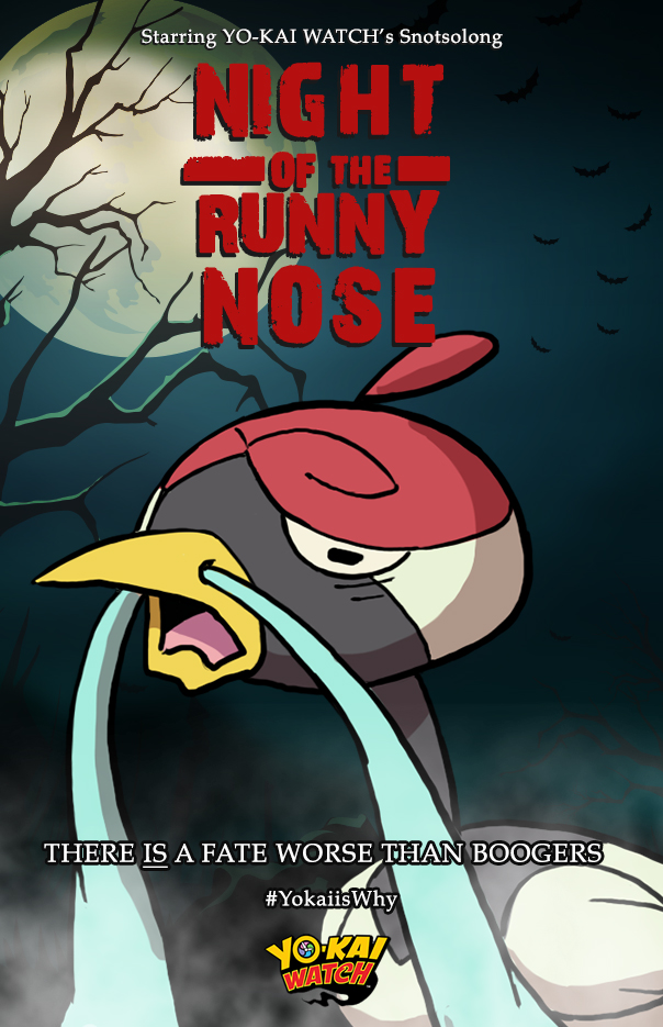 “Getting the winter season sniffles? It might be because of Snotsolong. Snotsolong gives you a runny nose that never stops. A crane Yo-kai with an insanely runny nose, Snotsolong’s snot is so heavy he can’t even fly! He likes to share his miserable cold with everyone.”