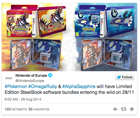 The Pokemon Omega Ruby Limited Edition SteelBook and Pokemon Alpha Sapphire Limited Edition SteelBook software bundles can be pre-ordered at GAME and the Official Nintendo UK Store now while supplies last.