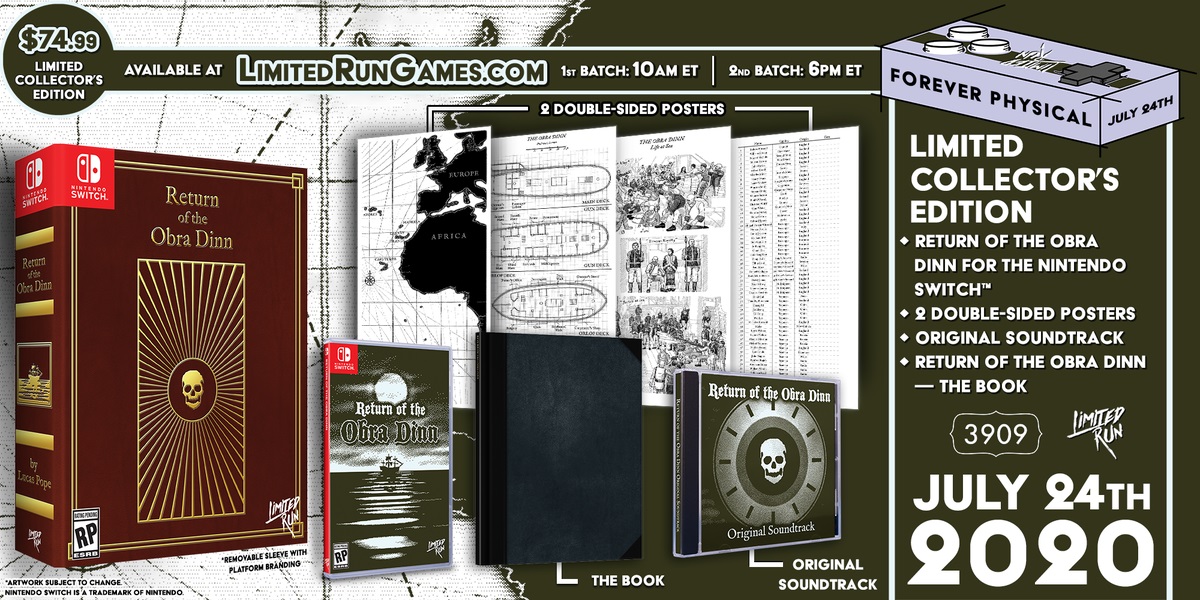 First up is Return of the Obra Dinn. Copies include the game, soundtrack, two double-sided posters and the book, all wrapped in special packaging. Pre-orders open on July 24 at 7 AM PT / 10 AM ET and then again at 3 PM PT / 6 PM ET.