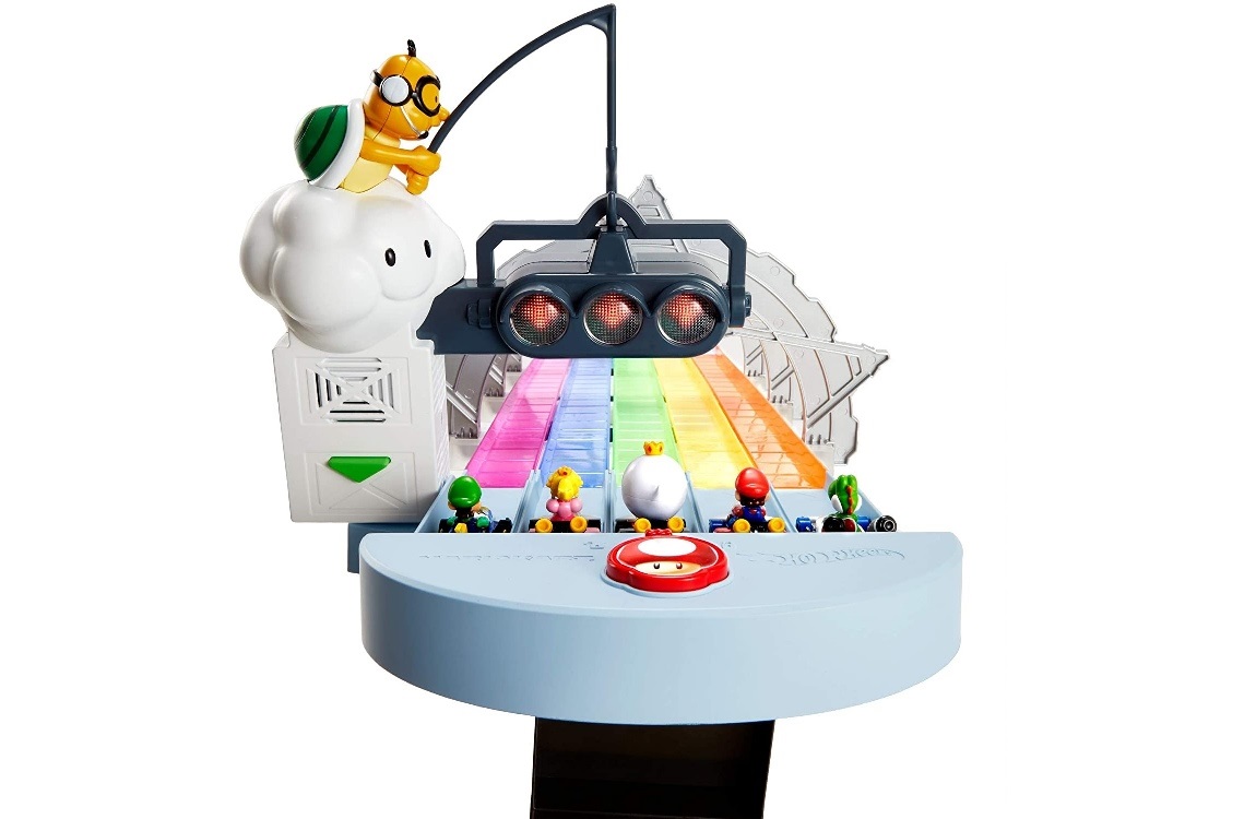 The Amazon page actually doesn’t have much in terms of actual information. However, based on official photos, you’ll be able to race with Mario, Luigi, Peach, Yoshi, and King Boo down the Rainbow Road-inspired track. Lakitu is also hanging out at the front of the course.