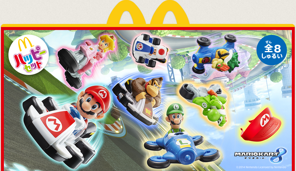 McDonald’s isn’t leaving Japan out of the Mario Kart 8 toy fun. Starting today, those who purchase a Happy Meal can receive a Mario visor or toy for Mario, Luigi, Donkey Kong, Peach, Yoshi, Bowser, and Toad.