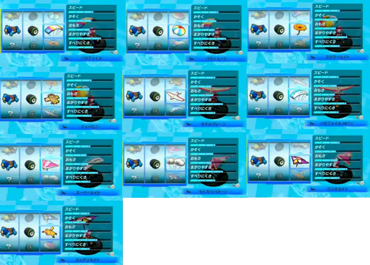 Mario Kart 8 Gliders – Super Glider, Cloud Balloons, Flower Glider, Koopa Kite, MKTV Parafoil, Parachute, Para-glider, Peach Parasol, Sail Plane, Waddlewing Kite, Wario Glider.