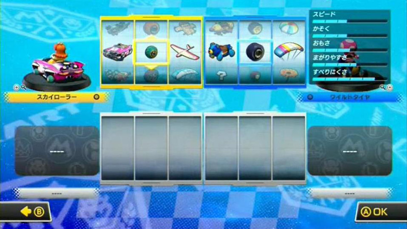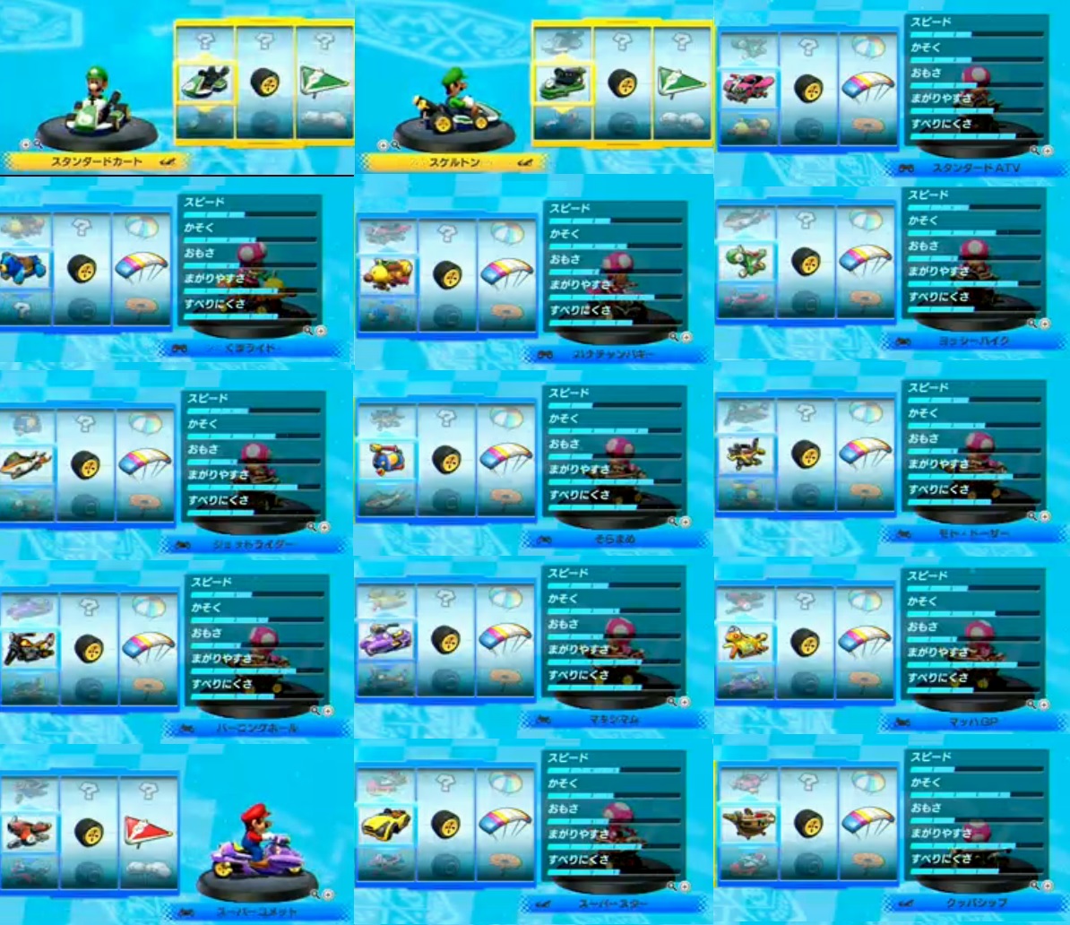 Mario Kart 8 Karts – Standard Kart, Airship, Classical Cat, Bad Wagon, G-Force, Para-Bidybud, Pipe Frame, Princess Coach, Sneaker, Steel Diver, Superstar, Tri-Smash, Turbo One.