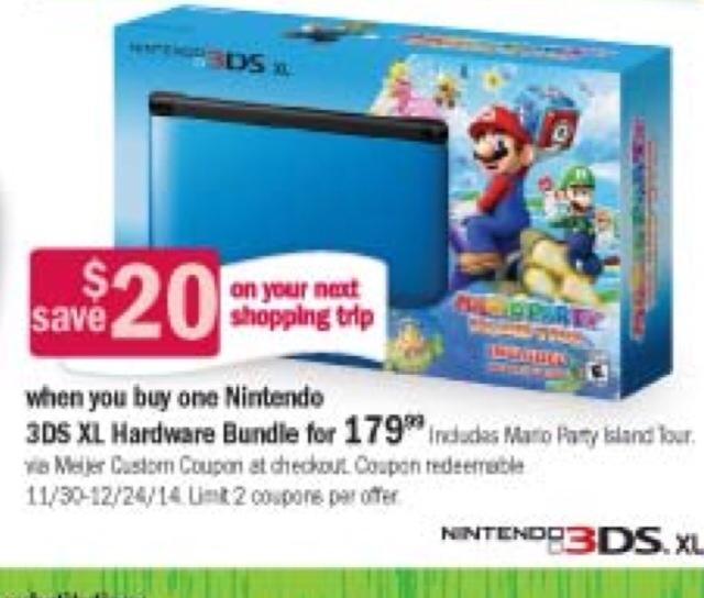Nintendo will soon release a new 3DS XL bundle featuring Mario Party: Island Tour, a leaked ad from Meijer reveals. The package contains a blue system variation. The ad above seems to be for Black Friday, so Nintendo’s latest bundle should be available this month.