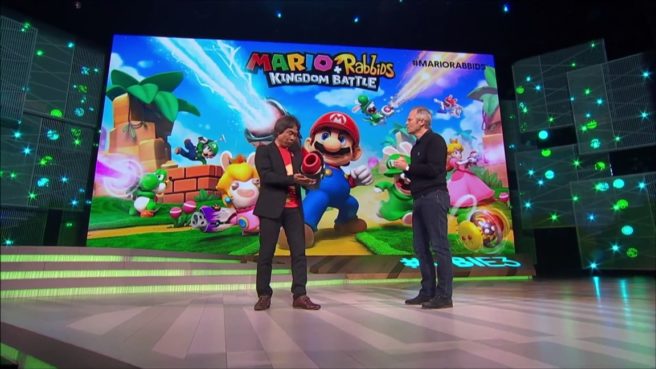 Following several leaks, Mario + Rabbids Kingdom Battle is official. The game was unveiled at Ubisoft’s E3 2017 press conference today. Shigeru Miyamoto appeared on stage to introduce the game.