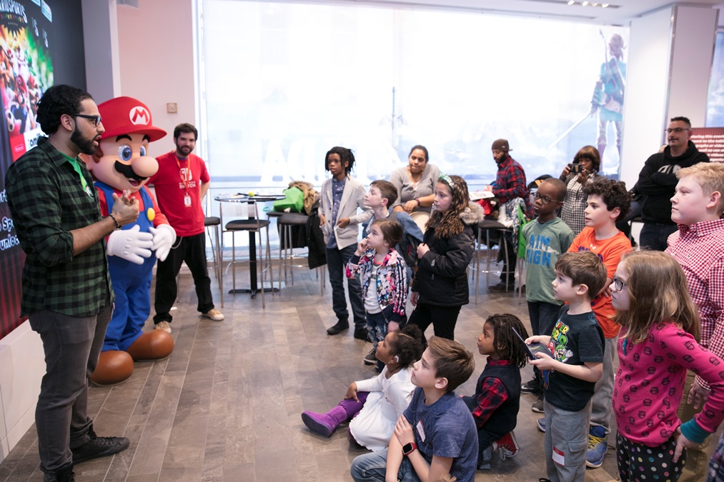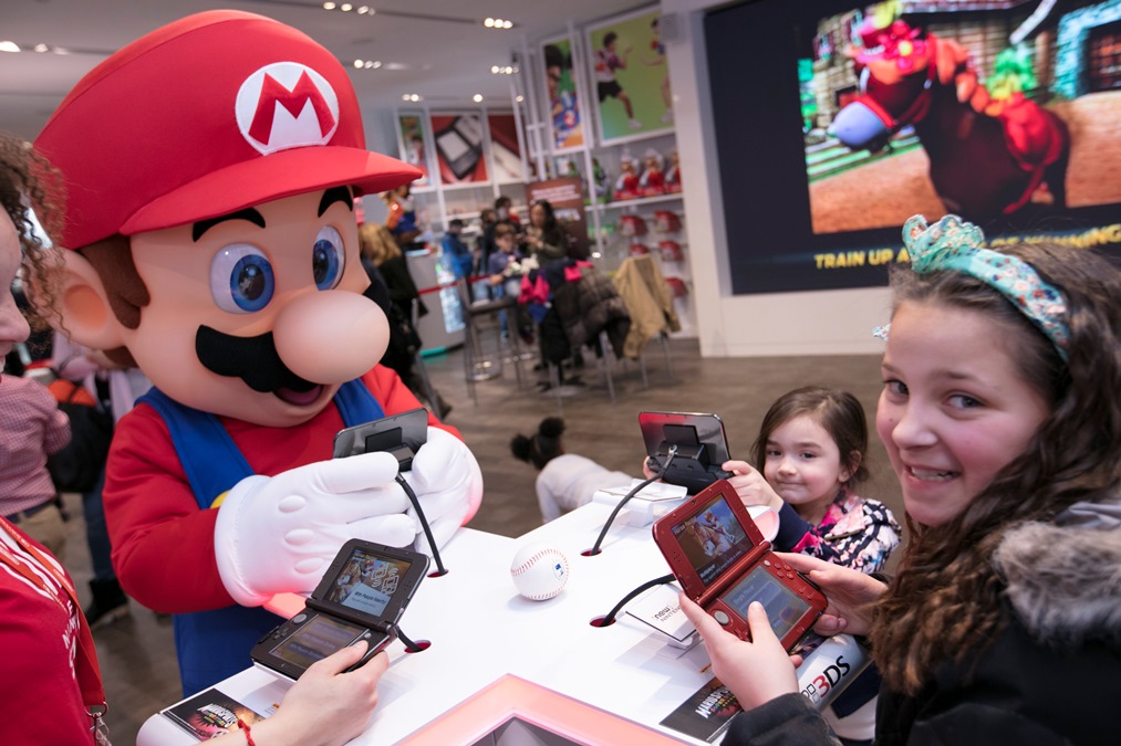In this photo provided by Nintendo of America, Gia P. from Bronx, NY and Alyssa P. from Bronx, NY meet with Mario at the Nintendo NY store in Rockefeller Plaza on Friday, March 24. Fans gathered to celebrate the launch of Mario Sports Superstars, an action-packed Nintendo 3DS game that finds players competing in five full-featured sports: Baseball, Soccer, Golf, Tennis and Horse Racing.