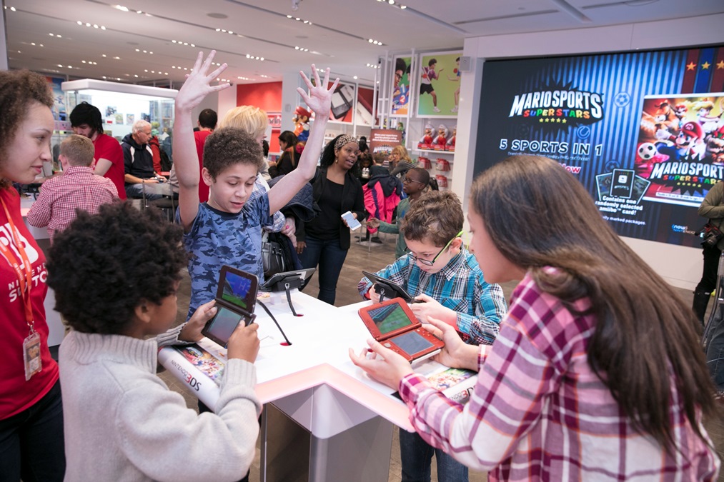 In this photo provided by Nintendo of America, fans gather at the Nintendo NY store in Rockefeller Plaza to celebrate the launch of the Mario Sports Superstars game and compete in an on-site tournament. Fans played five different sports from the game and had the chance to meet Mario. Mario Sports Superstars is an action-packed Nintendo 3DS game that finds players competing in five full-featured sports: Baseball, Soccer, Golf, Tennis and Horse Racing.