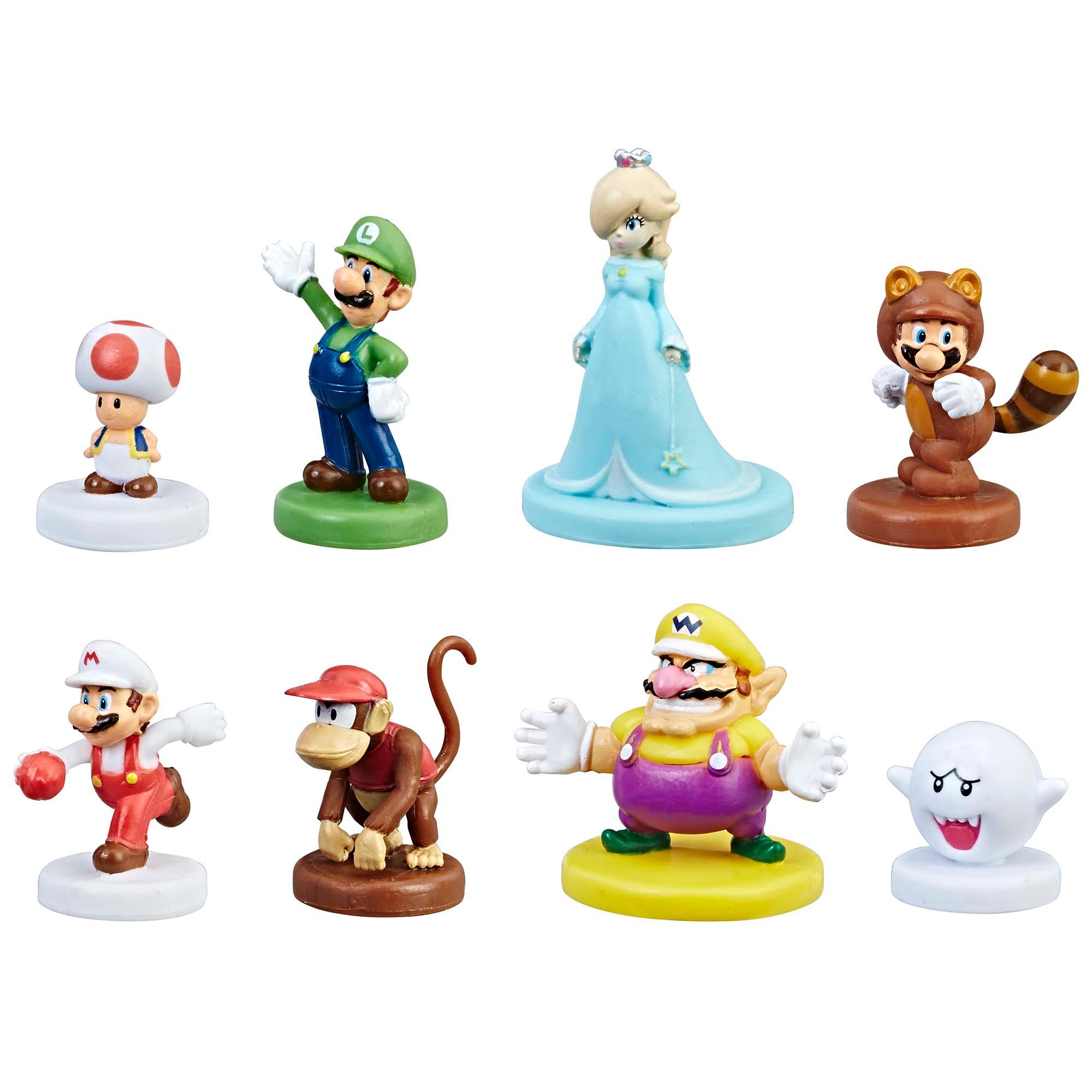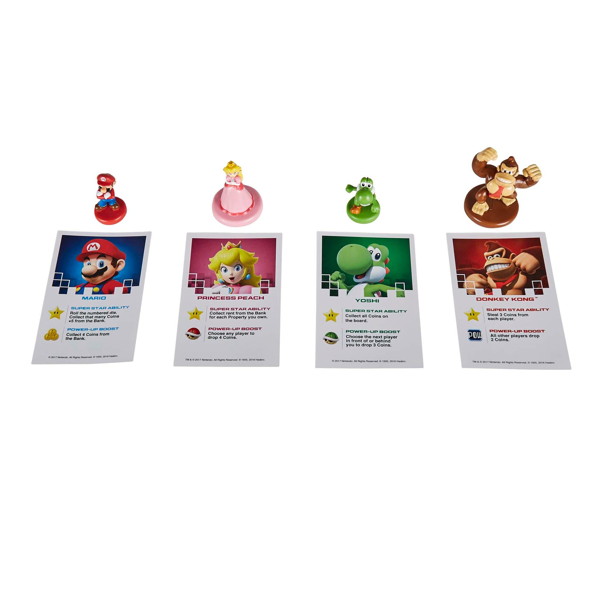 Battle legendary BossesIncludes gameboard, 4 Nintendo Character tokens (Mario, Princess Peach, Yoshi, and Donkey Kong), 4 Character cards, 4 Reminder cards, 8 Boss cards, 16 Title Deed cards, 1 Numbered die, 1 Power -up die, 90 coins, and game guide.