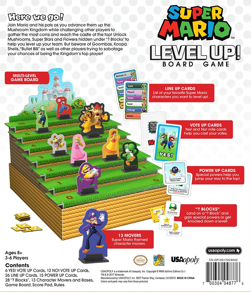 A new Mario board game is coming from USAopoly, titled Super Mario Level Up!. You and a group of friends will “Join Mario and his pals as you advance them up the Mushroom Kingdom while challenging other players to gather the most coins and reach the castle at the top.” A 3D game board, 13 Character Movers, Power Up cards, and ? Block Chips are all included.