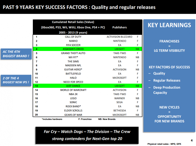 In its latest financial report, Ubisoft provides a look at the top 20 best-selling game series between 2005 and 2013. Mario, Assassin’s Creed, Wii Fit, and other prominent franchises make the cut. You can find the full results above.