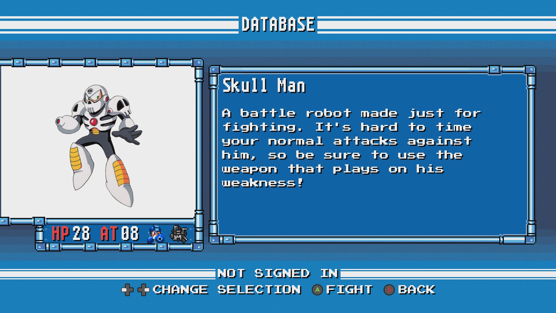 Database: Each game has its own database that contains enemy images, descriptions and flavor text. From here you can also battle each of the Robot Masters using any weapon from the respective game as sort of a “practice run” that lets you get their patterns down before tackling them in the full game.
