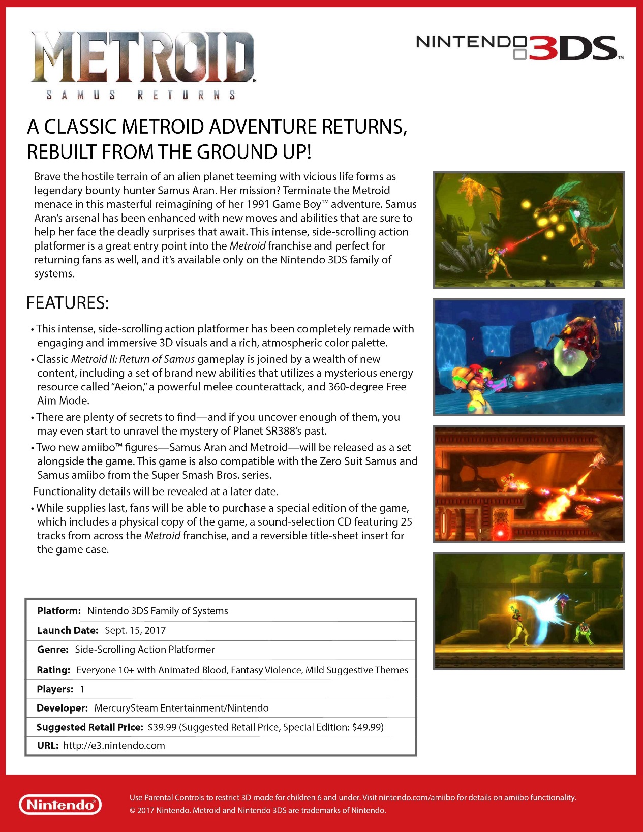 When Nintendo unveiled Metroid: Samus Returns for 3DS yesterday, a special version of the game was announced. In North America, the Metroid: Samus Returns Special Edition comes with a copy of the game, sound selection CD, and a reversible title-sheet insert.