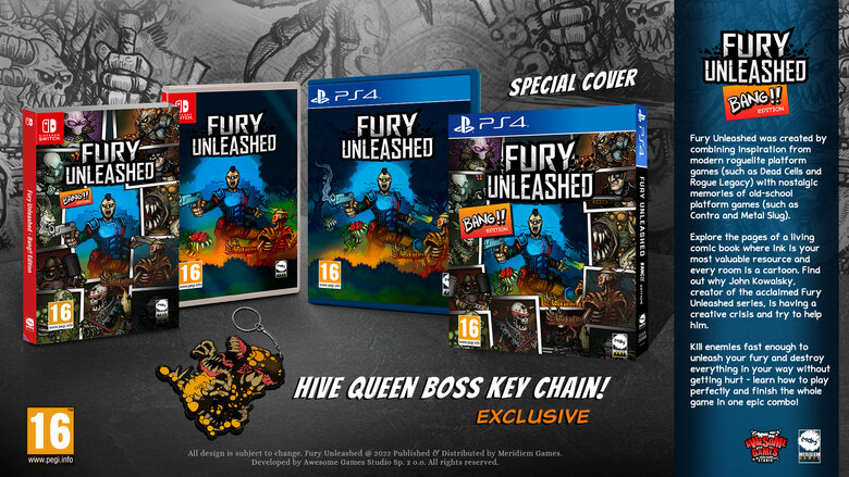 Meridiem Games will be in charge of the design, manufacture, and distribution of the Fury Unleashed: Bang!! Edition across European specialist retailers. All copies feature a specially designed cover emulating the pages of a comic book (one of the main features of the game) and an exclusive Hive Queen Boss keychain.