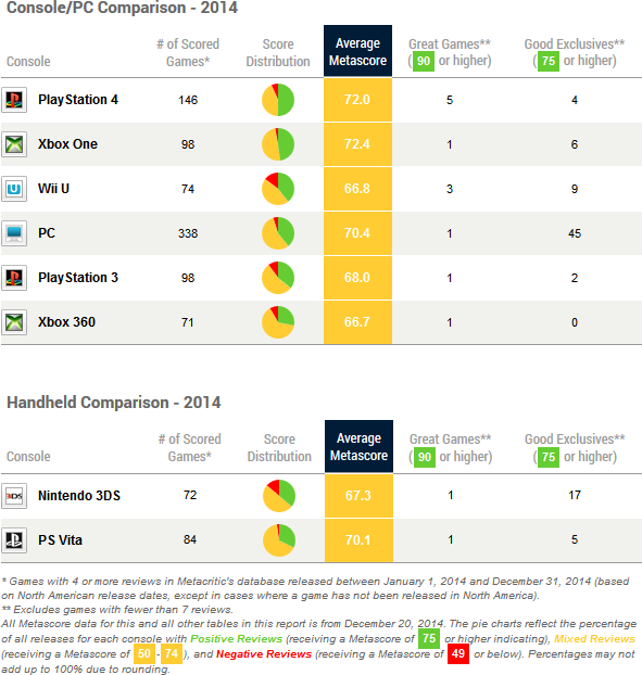 PS4 topped all consoles with an average metascore of 73.4 percent. Wii U was next with 72.6 percent, followed by PS3 at 70.1 percent, PC at 69.1 percent, Xbox One at 67.7 percent, and Xbox 360 at 66.9 percent.