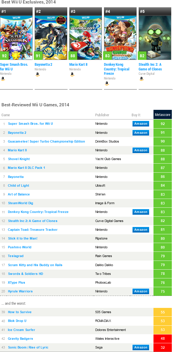 Wii U accounted for 44 reviewed games on Metacritic. The console had no games with an average of 90 or higher, but had four exclusives with scores of 75 or higher.