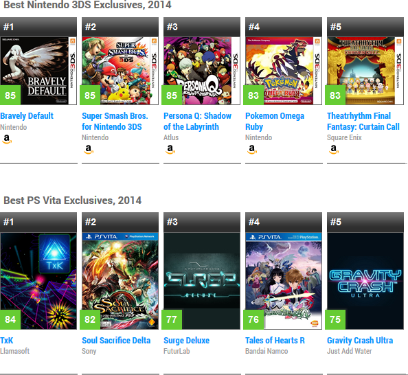 There were 57 3DS games in Metacritic’s database, of which no titles had an average of 90 or higher much like Wii U. However, 20 exclusive releases scored 75 or higher.