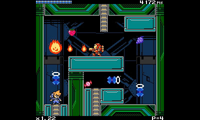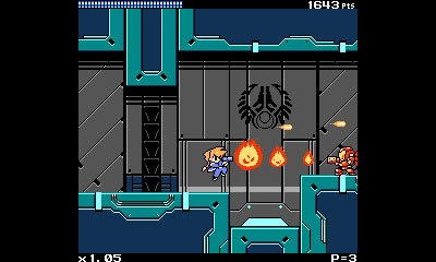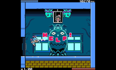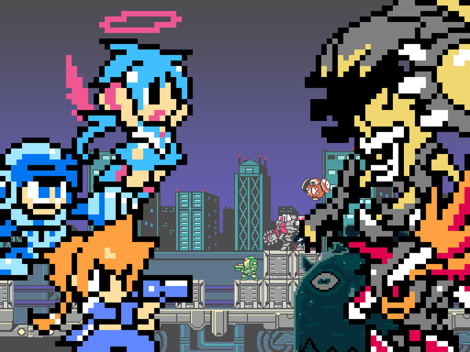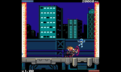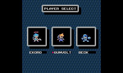 Mighty Gunvolt features a complete 8-bit style. Gunvolt, Eriko, and Beck are included as playable characters.