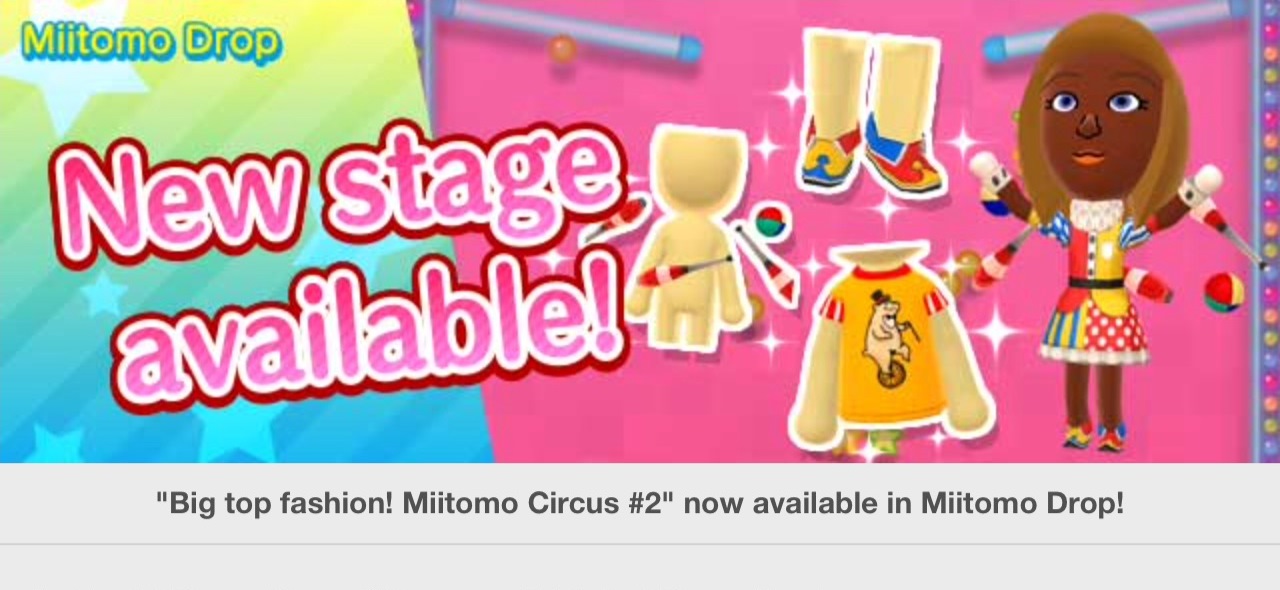 Miitomo has been updated with new content. Players can nab the latest items in the Miitomo Drop stage, “Big top fashion! Miitomo Circus #2”.