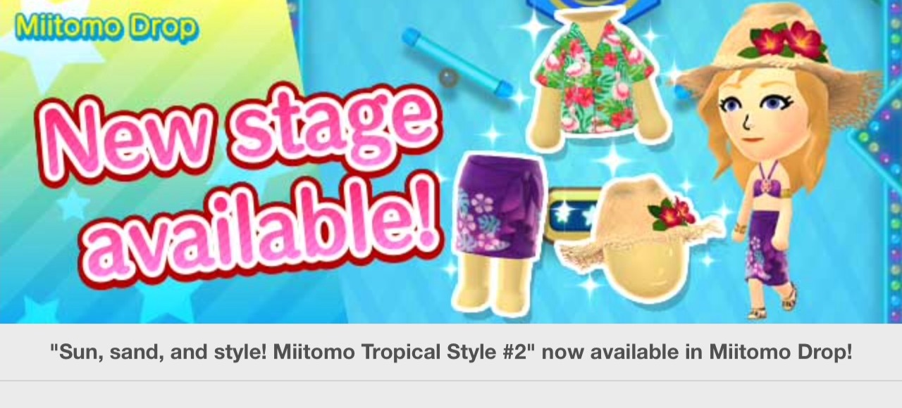 Miitomo has been updated with new content. Players can nab the latest items in the Miitomo Drop stage, “Sun, sand, and style! Miitomo Tropical Style #2”.