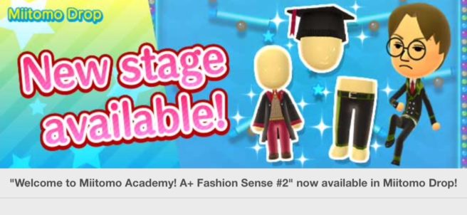 Miitomo has been updated with new content. Players can nab the latest items in the Miitomo Drop stage, “Welcome to Miitomo Academy! A+ Fashion Sense #2”.