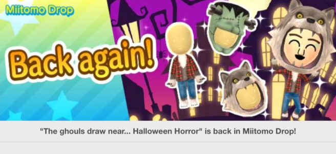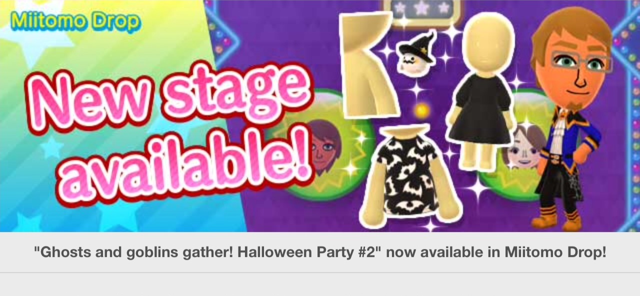 Miitomo has been updated with new content. Players can nab the latest items in the Miitomo Drop stage, “Ghosts and goblins gather! Halloween Party #2”.