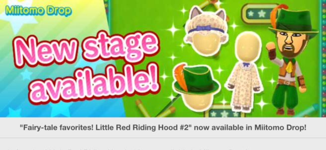 Miitomo has been updated with new content. Players can nab the latest items in the Miitomo Drop stage, “Fairy-tale favorites! Little Red Riding Hood #2”.