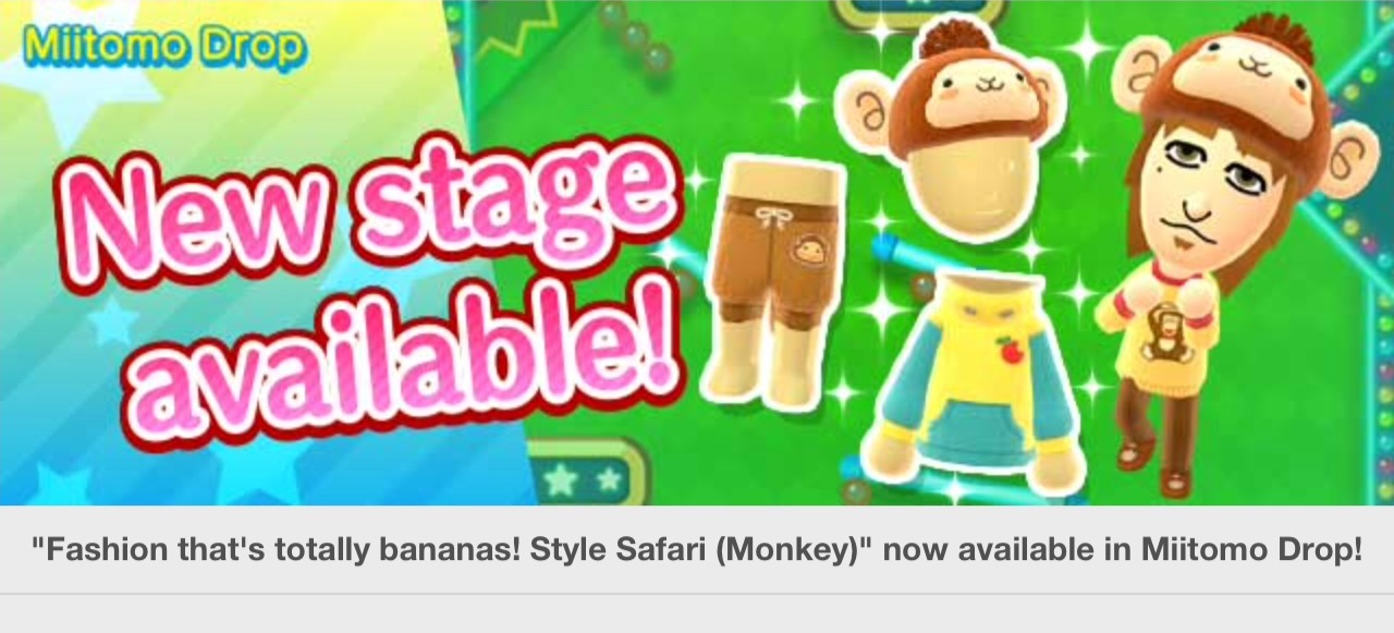 Miitomo has been updated with new content. Players can nab the latest items in the Miitomo Drop stage, “Fashion that’s totally bananas! Style Safari (Monkey)”.