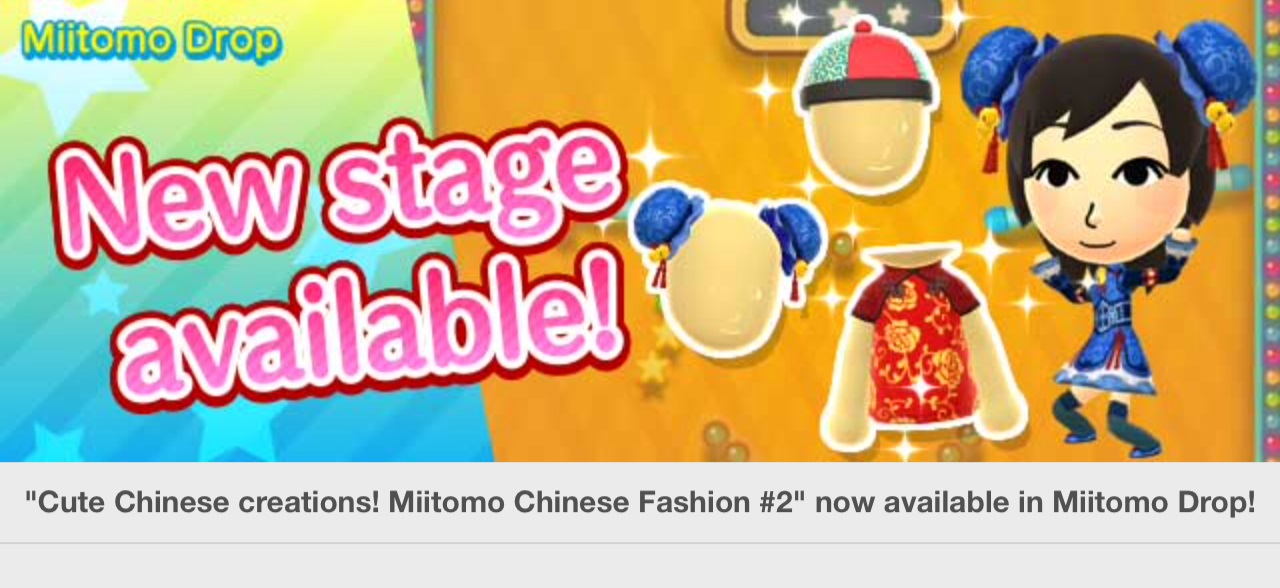 Miitomo has been updated with new content. Players can nab the latest items in the Miitomo Drop stage, “Cute Chinese creations! Miitomo Chinese Fashion #2”.