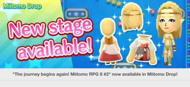 Miitomo has been updated with new content. Players can nab the latest items in the Miitomo Drop stage, “The journey begins again! Miitomo RPG #2”.