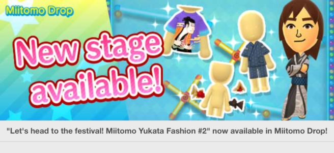 Miitomo has been updated with new content. Players can nab the latest items in the Miitomo Drop stage, “Let’s head to the festival! Miitomo Yukata Fashion #2”.