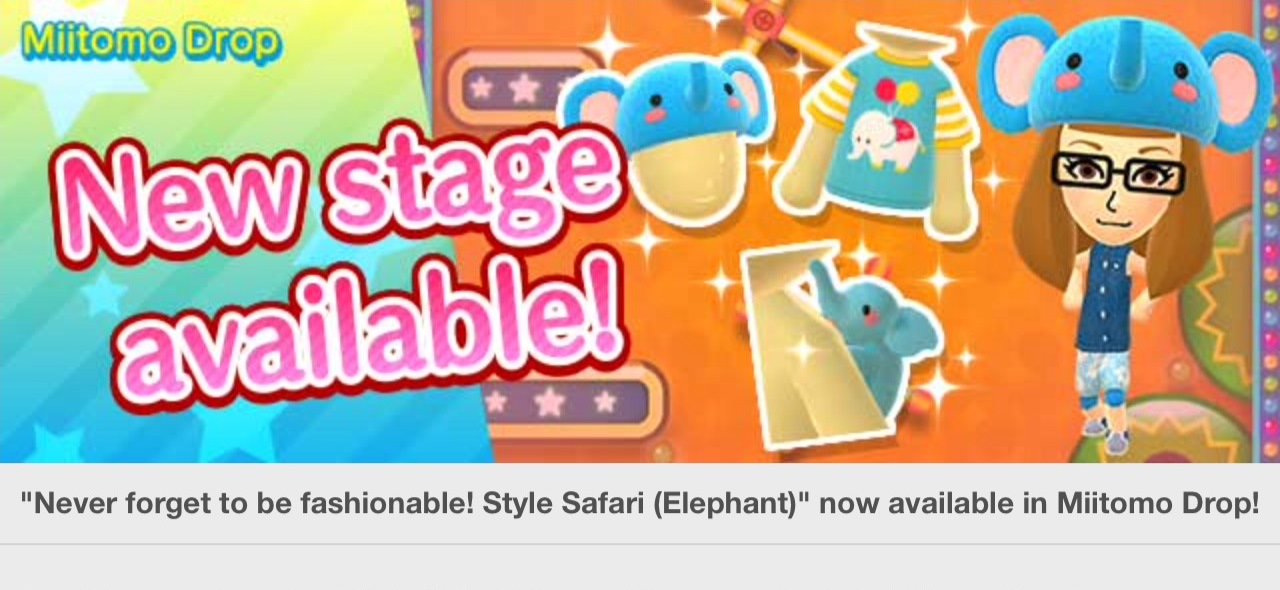 Miitomo has been updated with new content. Players can nab the latest items in the Miitomo Drop stage, “Never forget to be fashionable! Style Safari (Elephant)”.