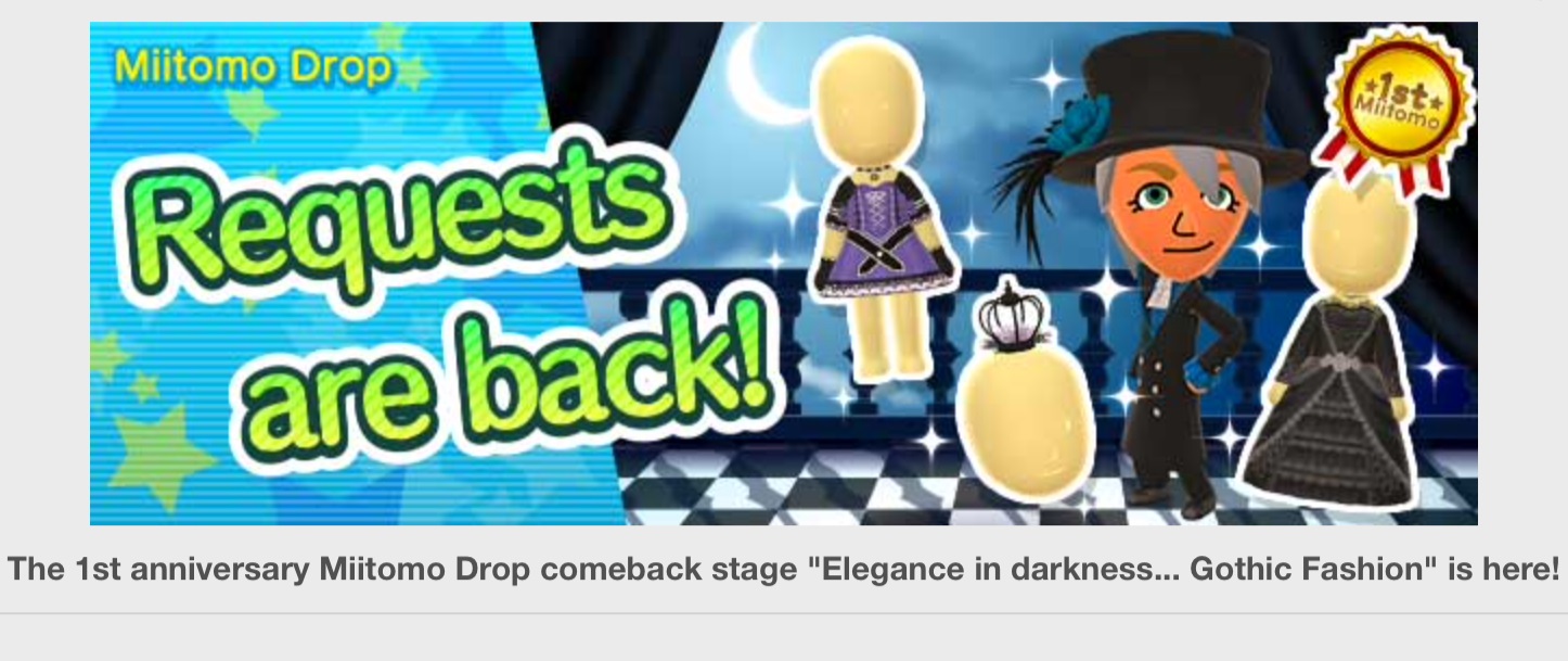 In celebration of Miitomo’s first anniversary, Nintendo has brought back the “Elegance in darkness… Gothic Fashion” stage as voted in through a Twitter survey. Users can obtain popular items in this coin-exclusive special level.