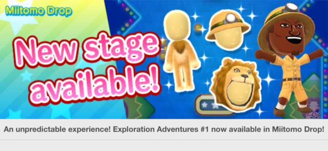 Miitomo has been updated with new content. Players can nab the latest items in the Miitomo Drop stage, “An unpredictable experience! Exploration Adventures #1”.
