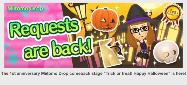 In celebration of Miitomo’s first anniversary, Nintendo has brought back the “Trick or treat! Happy Halloween” stage as voted in through a Twitter survey. Users can obtain popular items in this coin-exclusive special level.