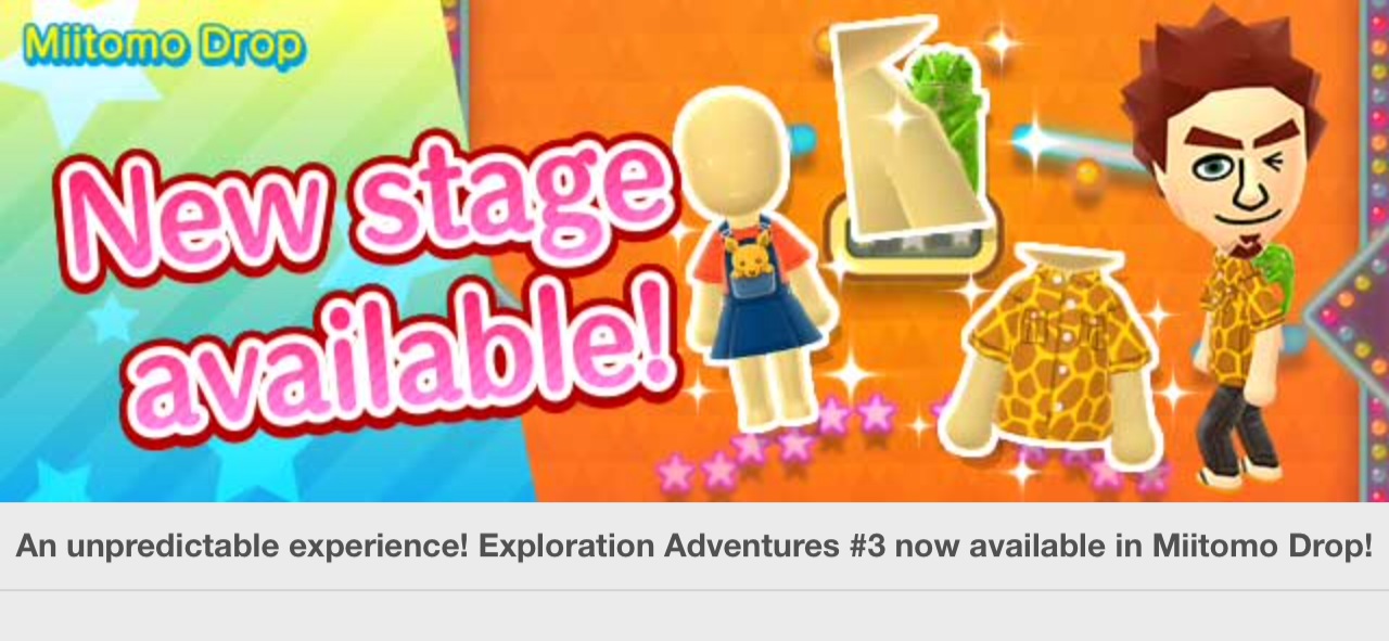 Miitomo has been updated with new content. Players can nab the latest items in the Miitomo Drop stage, “An unpredictable experience! Exploration Adventures #3”.