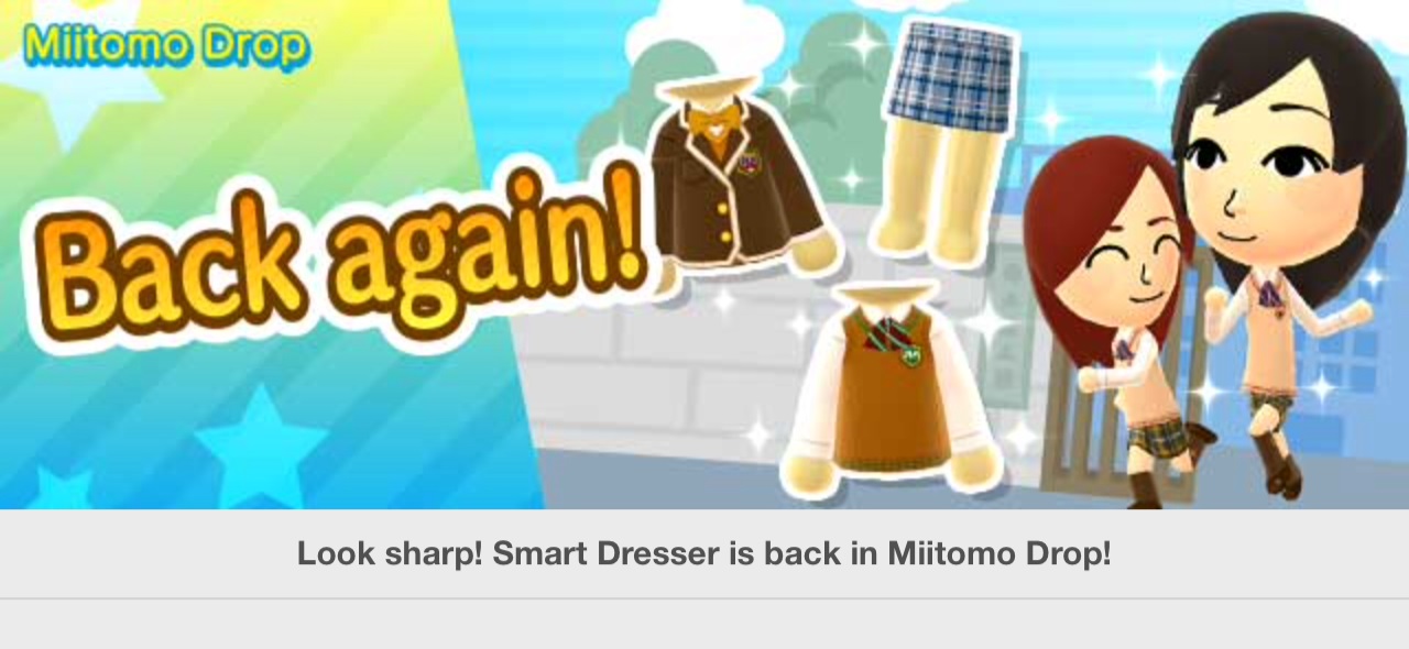 In celebration of Miitomo’s first anniversary, Nintendo has brought back the “Look sharp! Smart Dresser” stage as voted in through a Twitter survey. Users can obtain popular items in this coin-exclusive special level.