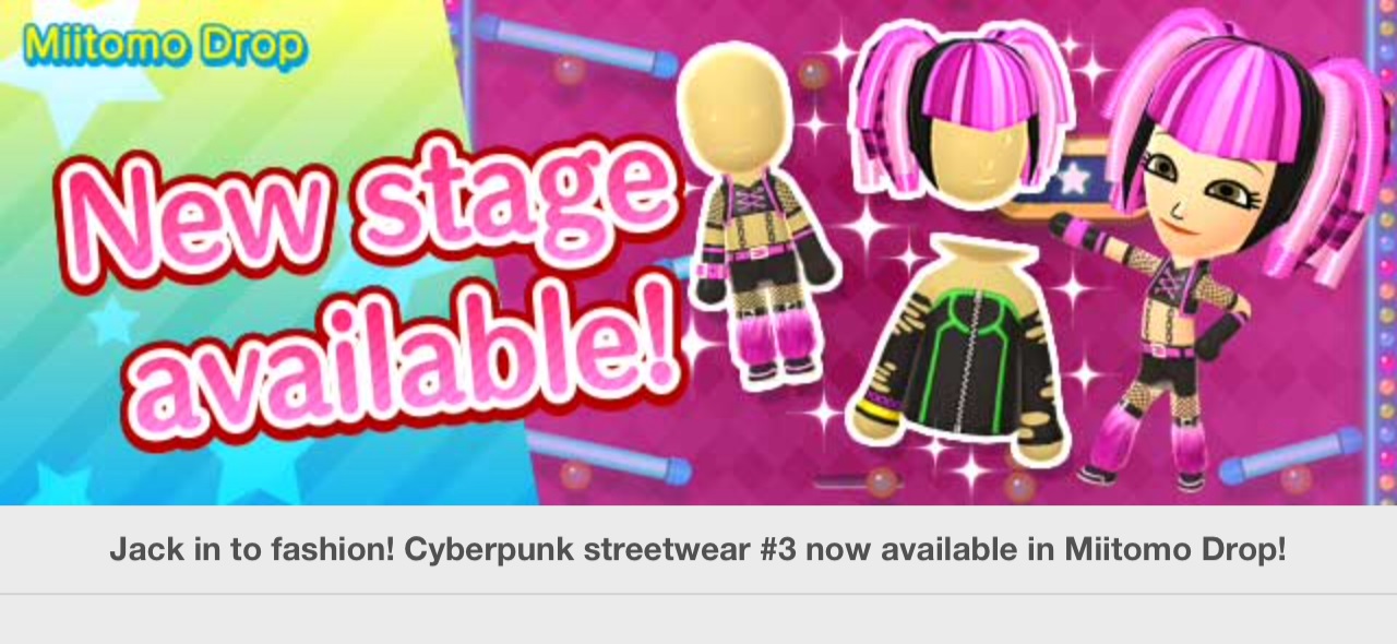 Miitomo has been updated with new content. Players can nab the latest items in the Miitomo Drop stage, “Jack in to fashion! Cyberpunk streetwear #3”.