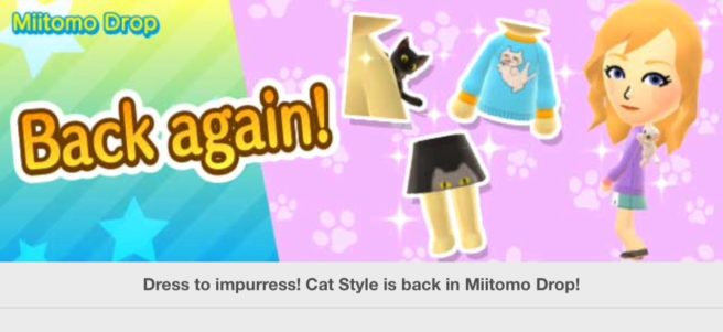 Miitomo has been updated with new content. Players can nab the latest items in the Miitomo Drop stage, “A second impurression! Cat Style Redux #2”.
