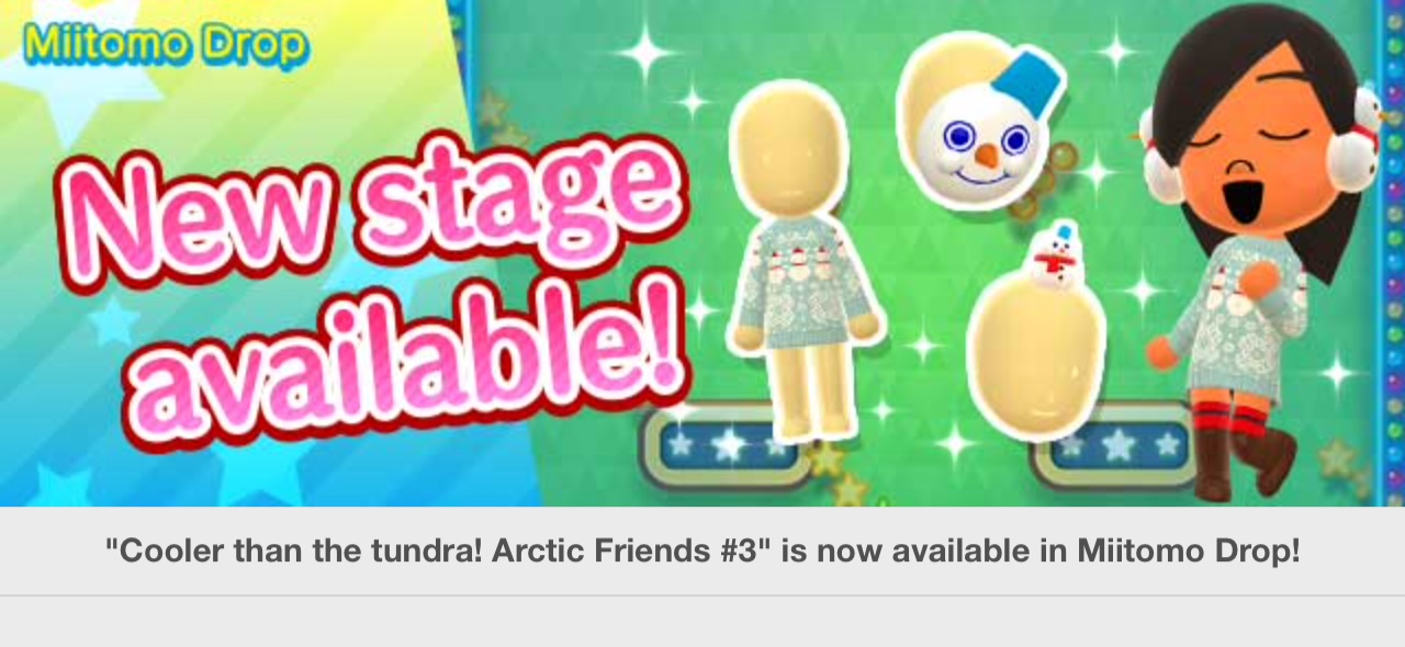 Miitomo has been updated with new content. Players can nab the latest items in the Miitomo Drop stage, “Cooler than the tundra! Arctic Friends #3”.