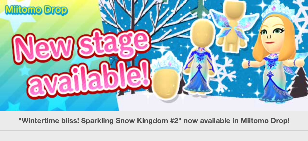 Miitomo has been updated with new content. Players can nab the latest items in the Miitomo Drop stage, “Wintertime bliss! Sparkling Snow Kingdom #2”.