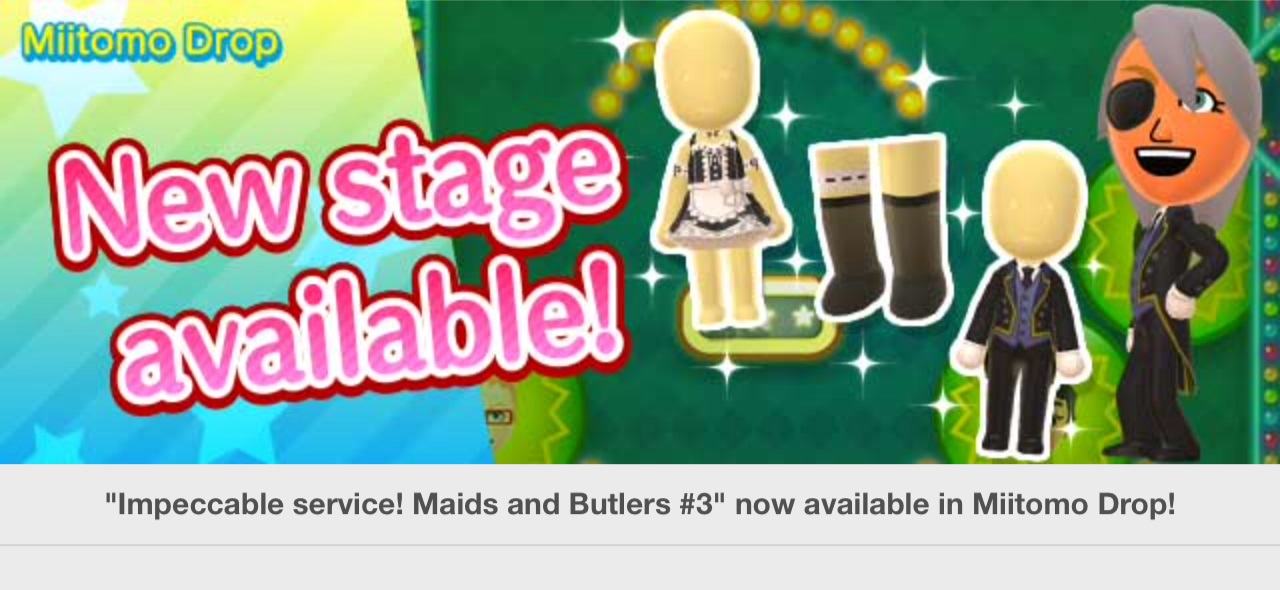 Miitomo has been updated with new content. Players can nab the latest items in the Miitomo Drop stage, “Impeccable service! Maids and Butlers #3”.