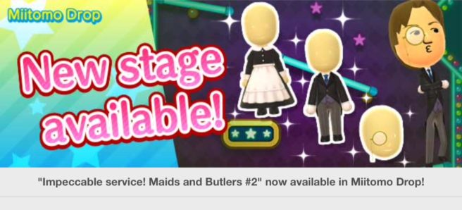 Miitomo has been updated with new content. Players can nab the latest items in the Miitomo Drop stage, “Impeccable service! Maids and Butlers #2”.