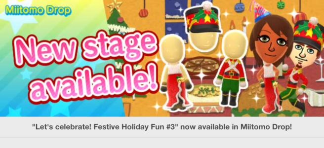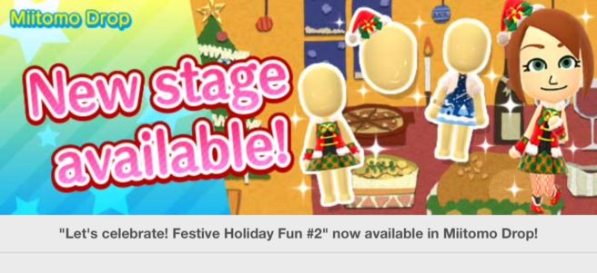 Miitomo has updated with a new Miitomo Drop stage, “Let’s celebrate! Festive Holiday Fun #2”.