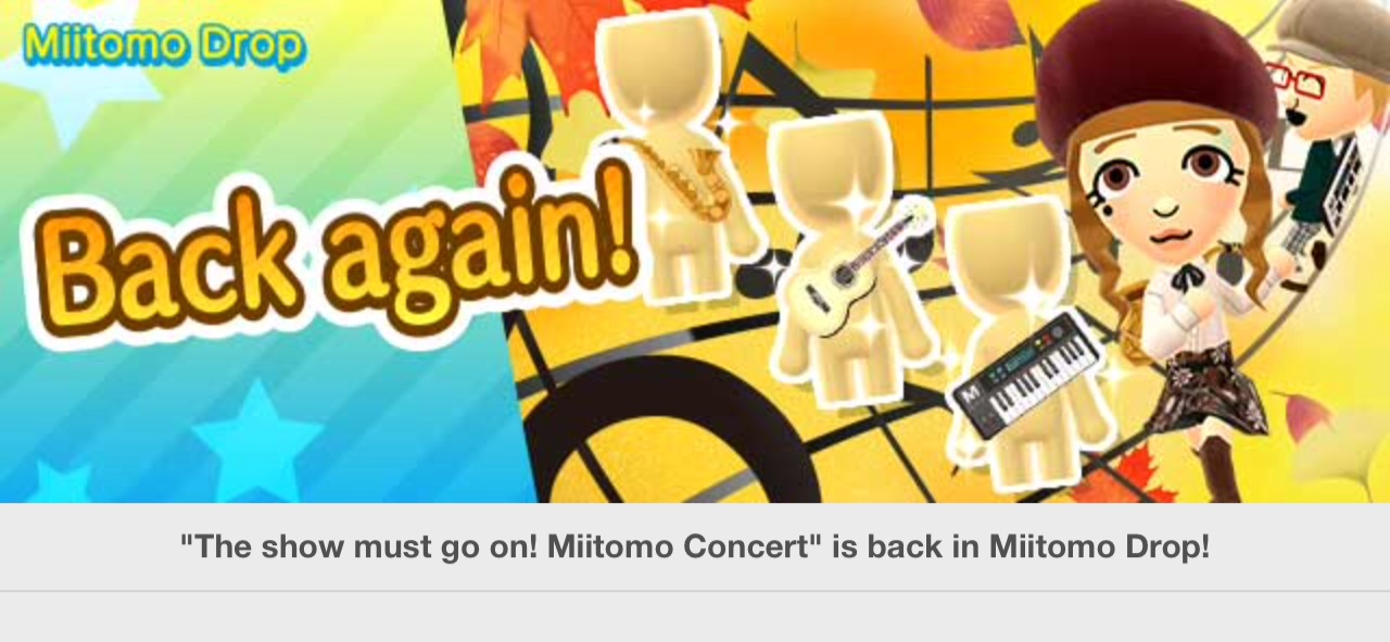 “The show must go on! Miitomo Concert” is the returning stage theme. They provide the following: