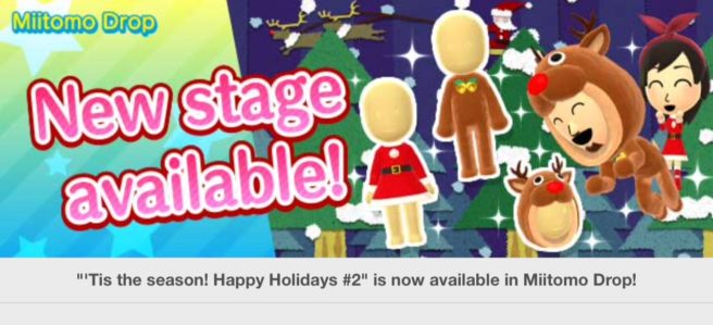 Miitomo has updated with a new Miitomo Drop stage, “‘Tis the season! Happy Holidays #3”.