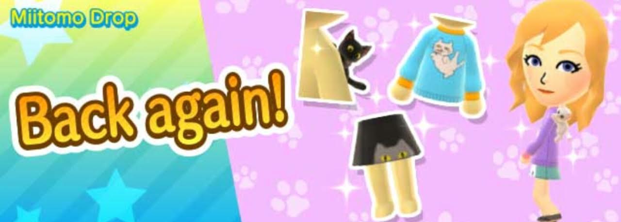 Miitomo’s latest update brings back another set of Miitomo Drop items, “Dress to impurress! Cat Style”. By using coins or game tickets, players can get their paws on the following items: