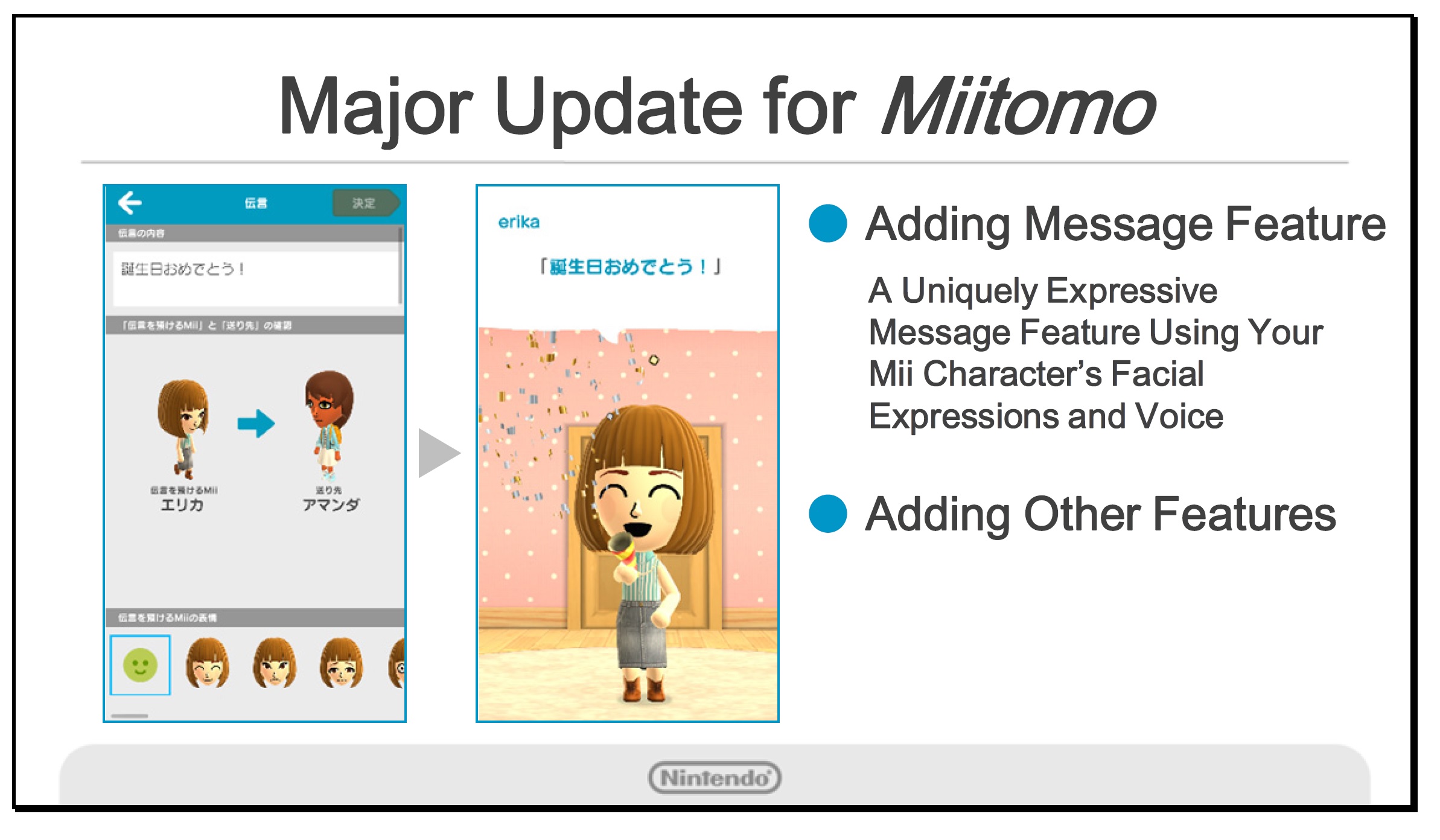 During its latest financial results briefing, Nintendo teased a major update planned for Miitomo. President Tatsumi Kimishima mentioned that the patch “will introduce a unique message feature that lets you use your Mii character’s facial expressions and voice to send any message you want in expressive one-on-one communication.”