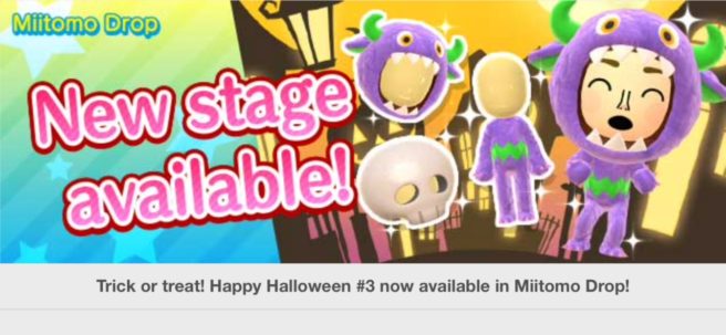Miitomo has been updated with new content once again. Players can nab some new items in the latest Miitomo Drop stage, “Trick or treat! Happy Halloween #3”.