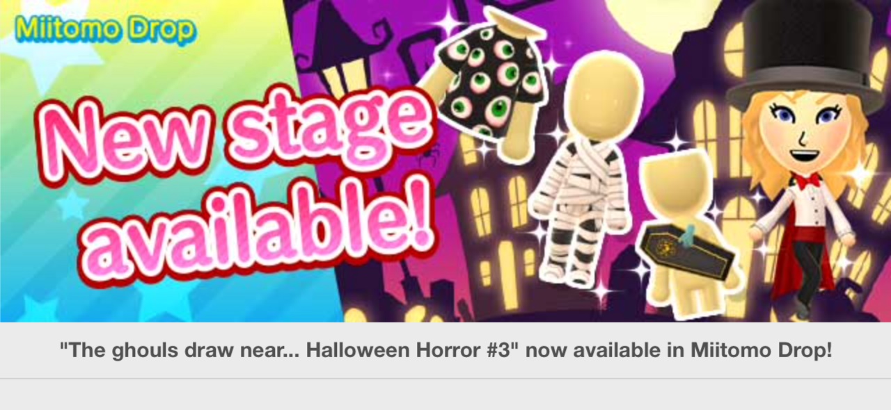 Miitomo has been updated with new content once again. Players can nab some new items in the latest Miitomo Drop stage, “The ghouls draw near… Halloween Horror #3”.