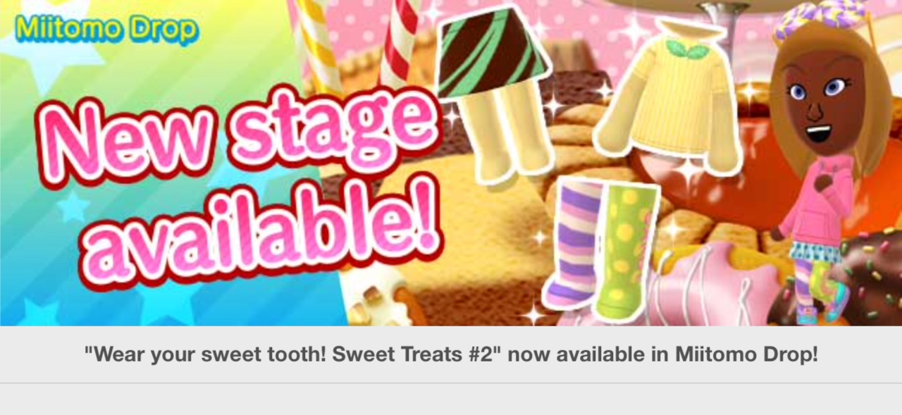 Miitomo has been updated with new content once again. Players can nab some new items in the latest Miitomo Drop stage, “Wear your sweet tooth! Sweet Treats #2”.